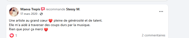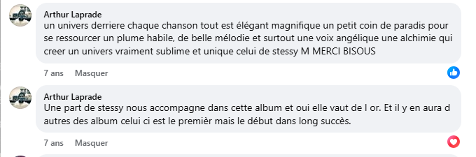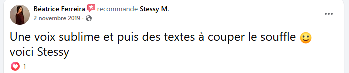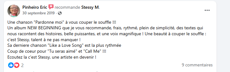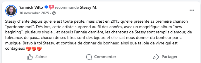 « Bravo Stessy M, que le temps nous fait toujours apprécier, avec sa couleur de voix et son expression artistique. Nous ne saurions qu’encourager un plus grand nombre à rejoindre l’artiste sur toutes les plateformes de distribution streaming, ainsi que le visionnage sur Youtube de toutes [ses] belles réalisations.»